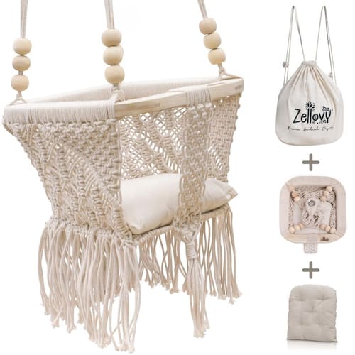 Cadeira de balanço para bebês macramê ecológica que protege a pele do seu bebê de corantes tóxicos ou produtos químicos nocivos, o ZELLOVY Swing é o item essencial para qualquer pai. Nossos balanços infantis são um recurso valioso quando os pais precisam de ajuda para acalmar um bebê agitado ou um lugar seguro para seus filhos enquanto eles acompanham as tarefas domésticas. Nosso balanço infantil de macramê feito à mão é uma excelente combinação para famílias que seguem estilos de vida minimalistas ou sustentáveis e procuram uma cadeira de balanço para bebês não tóxica. É um balanço de bebê boho luxuoso para berçário e uma bela escolha para decoração de bebê boêmio. - Orgânico premium que protege a pele do seu bebê – nosso balanço de macramê é cuidadosamente feito à mão com corda de algodão 100% orgânico e madeira de manga sustentável. Nossos balanços sem produtos químicos são suaves para a pele do seu bebê. Ao escolher nossos conjuntos de balanço boho para bebê, você está tomando uma decisão consciente de priorizar a segurança do seu filho enquanto também apoia o meio ambiente. - Ecológico e certificado CPSIA – nosso balanço de bebê não tóxico é ecológico e seguro para o seu pequeno. Nosso balanço de rede para bebês é testado em laboratório quanto à conformidade com as diretrizes de certificação de produtos infantis dos EUA. Nosso balanço de bebê de qualidade de herança é resistente na parte superior e muito macio na parte inferior, garantindo que seus bebês se aconcheguem perfeitamente e com segurança em nossa cadeira infantil de crochê - Inclui almofada, mochila e miçangas Montessori: leve a hora de brincar do seu bebê para o próximo nível e mime-o com conforto extra e aconchego com nossa almofada macia e mochila de transporte elegante para facilitar o armazenamento. Mantenha-os entretidos por mais tempo com as emocionantes contas de brincar. Nossos brinquedos sensoriais apoiam o desenvolvimento do seu bebê, ajudando a melhorar suas habilidades motoras, humor, alerta e mobilidade - Design boho luxuoso – cada conjunto de balanço de macramê é obra de pura arte e artesanato. Nosso balanço infantil de macramê tem um design boho chique exclusivo e um lindo enfeite de franja que trará um toque elegante de decoração boho para sua sala de jogos, quarto ou quintal de sua casa - Configuração super simples: nosso balanço boêmio portátil para bebês é compacto, prático, conveniente e vem pronto para ser pendurado. Pendure o balanço do seu bebê em ambientes internos, externos, teto, árvores, varanda ou qualquer lugar resistente que possa suportar o peso do seu bebê. O conjunto de balanço externo é reforçado com um anel de metal. - Presente exclusivo feito à mão – nossa cadeira de balanço para bebês é um presente perfeito que certamente impressionará. Sua adorável aparência natural e cores neutras são perfeitas para fotografia de recém-nascidos, adereços de balanço, lista do bebê ou uma decoração exclusiva de berçário boêmio. Lindo presente de chá de bebê, presentes de aniversário, Dia das Mães, balanços de bebê para meninas e meninos, aniversários infantis e presentes de batismo - GARANTIA DE DEVOLUÇÃO DO DINHEIRO EM 30 DIAS - Nós protegemos. Se por algum motivo você não estiver totalmente satisfeito com a compra deste balanço de bebê de macramê, sinta-se à vontade para entrar em contato conosco e reembolsaremos você ou alteraremos o produto sem questionar. - Observe que nossos balanços são todos feitos à mão e viajaram da Índia por mar, recomendamos permitir que o balanço, a almofada e a bolsa de transporte arejem e até mesmo colocá-los sob luz solar quente para dissipar quaisquer aromas naturais residuais.