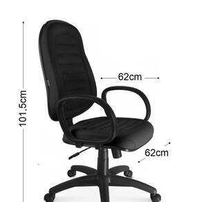 Cadeira giratória modelo presidente de espaldar alto com assento e encosto estruturado em madeira laminada e estofado com espuma injetada com densidade D45. Revestimento em sintético preto.