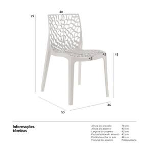 Cadeira modelo Gruvyer: Material: Polipropileno - Altura do encosto: 79 cm - Altura do assento: 43 cm - Largura do assento: 42 cm - Profundidade do assento: 42 cm - Distância entre os pés: 46 cm - Peso suportado: 130 kg - Produto certificado pelo INMETRO - Garantia: 3 meses.