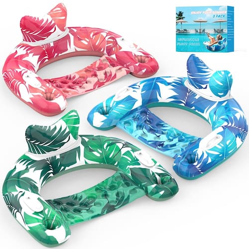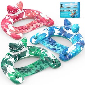 -?Pacote com 3 flutuadores de piscina econômicos?Nossas cadeiras flutuantes infláveis de 3 unidades apresentam um design em forma de U que é de alta qualidade e estável, não sendo fácil tombar ou inclinar. Assentos subaquáticos confortáveis mantêm seu corpo abaixo da superfície da água para mantê-lo fresco. Divirta-se flutuando na piscina durante o verão quente com sua família e amigos!