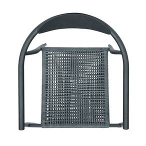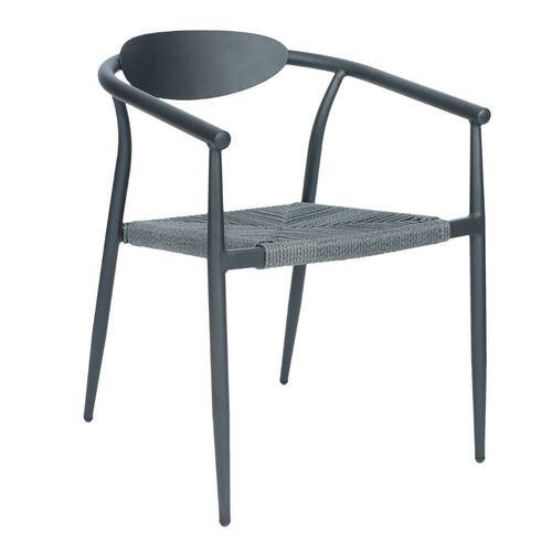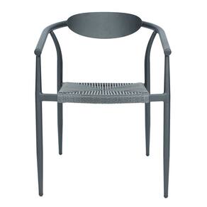 O assento é confeccionado em corda naútica em tons de cinza, harmonizando-se perfeitamente com a estrutura e proporcionando uma superfície confortável e visualmente interessante. A combinação do alumínio com o trançado confere à cadeira durabilidade e um toque de textura, ideal para diversos ambientes.