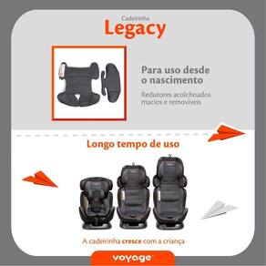 A cadeirinha Legacy Voyage, vai transportar seu filho em todas as fases do crescimento, com conforto e segurança. Tecido macio e muito acolchoada. Com 3 posições de inclinação sendo uma posição super inclinada para instalação de costas ao movimento e mais 2 posições para as crianças maiores de frente ao movimento, torna qualquer passeio seguro e confortável. Para acompanhar o crescimento da criança, possui almofadas internas removíveis e ajuste de altura do apoio de cabeça em 9 posições junto com a altura dos cintos de 5 pontos, deixando muito mais fácil a regulagem correta. Instalação fácil e com guias sinalizadas para a passagem dos cintos de segurança do veículo. Para facilitar a limpeza a capa e as almofadas são removíveis e laváveis à máquina. Cadeirinha aprovada pelo INMETRO conforme norma ABNT NBR 14400 para crianças do nascimento até 36kg (grupos 0+,1,2 e 3).