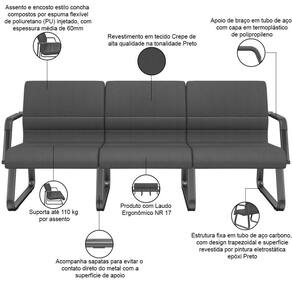 ProductWarranty: 90 dias após o do produto | ColorFamily: Preto | MaterialFamily: Crepe | OriginCountry: | Model: Lev | ColorSupplier: Preto | Color: Preto | OriginState: PR | ProductWeight: 17 kg | ColorSimple: Preto | ProductHeight: 82 cm | ProductContents: 01 Longarina, manual de instruções | Material: Tubo de Aço Carbono, Espuma ível Poliuretano, Crepe | ProductWidth: 198 cm | SupplierSimpleName: Cadeira Longarina 3 Lugares Recepção com Braço Pés Preto Lev P03 Crepe Preto - Lyam Decor | ProductInstructions: Produto para uso em ambiente interno, nao devendo ficar exposto ao sol, calor e umidade excessivos. | SizeDescription: Altura: 82 cm x Largura: 198 cm x Profundidade: 66 cm | ProductLength: 66 cm | Cor: Preto | Modelo detalhado: Lev Longarina 3 lugares Base Preta | Com apoio de braços: Sim | Materiais do aro para pés: na | Com rodas: Não | Requer montagem: Sim | Material do estofamento: Crepe | Com aro para pés: Não | Formato de venda: Unitário | de registrocertificação INMETRO: ABNT NBR 13962, ABNT ABNT NM 300, NR 17 | Tipo de cadeira de escritório: Cadeira Longarina, Sala de Espera | Modelo: Lev