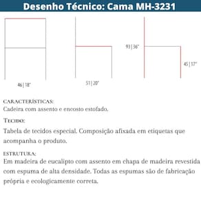 A cadeira de Jantar MH-3231 alia conforto e design, formando um produto que se adéqua facilmente a qualquer tipo de ambiente. Em madeira maciça de eucalipto de reflorestamento com encosto em palha natural, agregando qualidade e nobreza ao produto. O assento composto por chapa de madeira revestida com espumas de alta densidade, formando um conjunto de alto nível de conforto de durabilidade.