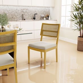 Apresentamos a você as cadeiras Milena, estruturadas em madeira maciça na cor castanho com telinha nos encostos, assentos estofados com espuma D-23.