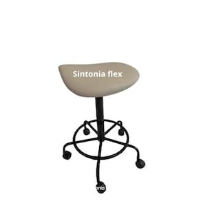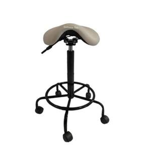 Cadeira sela - regulagem de altura a gás - espuma injetada , revestida em corano - bordas em pvc flexivel - apoio para os pés - pintura eletrostática - com rodízios - estrela de ferro - acabamento em PP