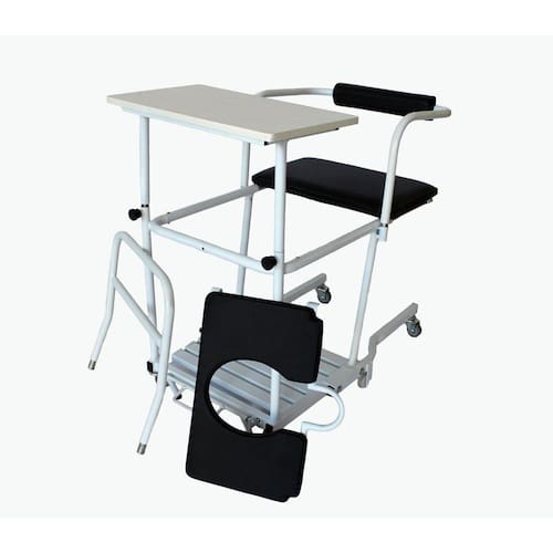 Cadeira Multiuso para auxiliar a movimentação de idosos e pessoas com dificuldades de locomoção. O Modelo completo vem com o assento estofado, guidão removível e guarda corpo, assento sanitário e mesa de apoio.