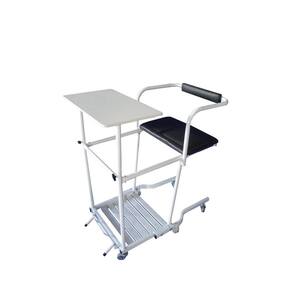 Almofada do assento em espuma ortopédica e courvin. O assento sanitário, para uso também no chuveiro, é fabricado em poliuretano expandido (PU) e pode ser molhado. A mesa de apoio, para refeições ou atividades recreativas, é fabricada em MDF revestido em fórmica nas duas face e bordas. Rodízios dianteiros e traseiros (4) e rodas fixas no centro (2): total seis rodas. Rodas pequenas para facilitar o acesso em baixo de sofás e poltronas. Freio de estacionamento acionado pelo cuidador com os pés.