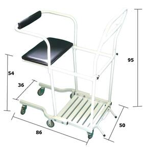 Comprimento: 86, cm, largura: 50 cm e altura: 95 cm. Peso máximo do paciente: 100 kg para uso doméstico. (não recomendado para hospitais) Fácil dirigibilidade pelo ambiente doméstico. Peças facilmente removíveis (guidão, assento e guarda corpo) para transporte em automóveis. Fabricado em aço tubular com tratamento antiferrugem e pintura eletrostática. Peso: : 21 kg Embalagem caixa de papelão: 45 x 50 x 66 cm