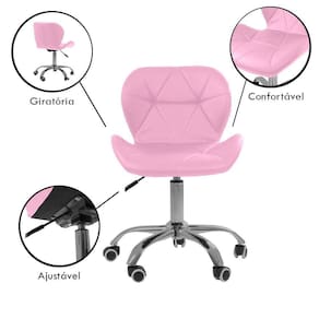 A cadeira conta com uma base giratória cromada e rodinhas. Isso facilita consideravelmente a sua locomoção no ambiente de trabalho.