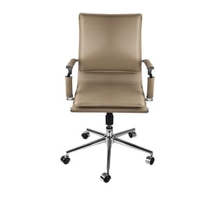Cadeira Office Soft Baixa Caramelo - com encosto acolchoado para um melhor conforto, estrutura em aço cromado e revestida em PU, possui regulagem de altura do assento com pistão á gás e sistema relax, possui base giratória em aço cromado com rodízios.