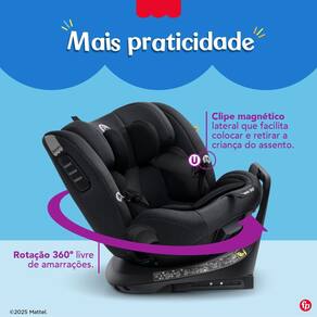 O sistema de fixação ISOFIX + Top Tether proporciona instalação segura e simples, enquanto a rotação 360º livre de amarrações e os clipes magnéticos laterais tornam mais fácil colocar e retirar a criança do assento.