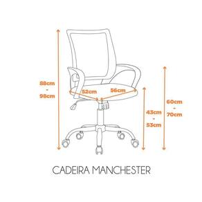 Perfeita para espaços compartilhados, a cadeira Manchester possui seu assento em espuma e base em tela junto a um apoio de lombar. O sistema relax também está presente nela, onde ela fica travada na posição vertical ou se movimenta de acordo com o balanço do corpo. Características: Encosto em Polipropileno Revestido de Tela, Assento em Madeira com Revestimento de Espuma, e Base em Aço Cromado Acabamento: Tela Suporta Ate 120 Kg Pés Reguláveis / Rodizio Material Dos Pés: Aço Possui Rodízios: Com Rodas Altura Do Assento Ate o Chão: 43 cm Como Utilizar: Cuidados Com o Produto / Pano Úmido Matéria Prima: Polipropileno (PP) / Madeira Revestimento Do Assento: Espuma Tipo Encosto: Sem Ajuste Reclinável Revestimento Do Encosto: Tela Conteúdo Da Embalagem: Encosto Assento Par de Braços Flange (Mecanismo) Pistão Anel (Acabamento entre pistão e estrela) Rodizio (Estrela + Rodinhas) Kit de Parafusos + Chave de Parafusos Dimensões: Altura: 98 cm Largura: 56 cm Profundidade: 52 cm Largura do Assento: 52 cm Peso: 10,86 kg Garantia do Fornecedor: 12 mesesCor: Preto