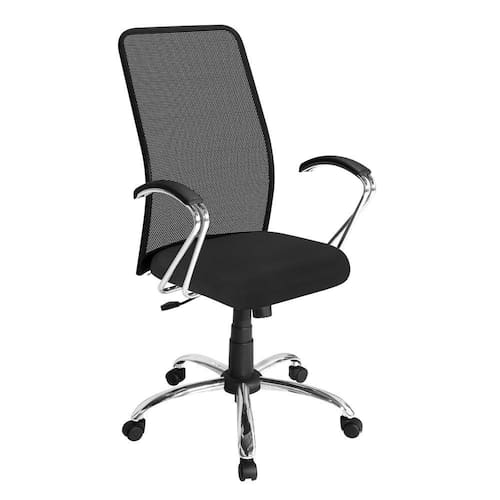 Base giratória cromada com relax e regulagem de altura com sistema a gás. Assento em tecido Space e encostos em tela super resistente preta Base e braço cromados.