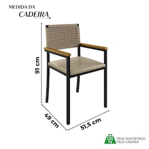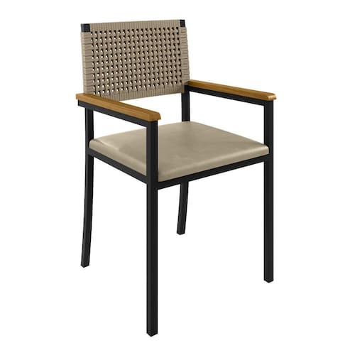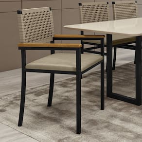 A cadeira com assento estofado e encosto trançado em corda náutica combina elegância e conforto.