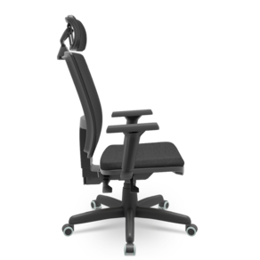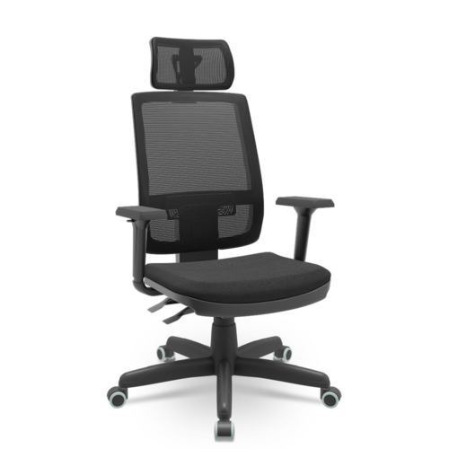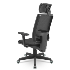 Encosto: Estrutura de sustentação externa constituída por uma estrutura fabricada em Polipropileno reforçado com fibra de vidro e uma moldura fabricada em ABS (Material Termoplástico com alta resistência mecânica), revestimento em tela 100% poliester tensionado na cor PRETA. Regulagem de ajuste na altura do apoio lombar e regulagem de altura do encosto em 9 posições distintas que percorrem um curso de 40 mm. Encosto de cabeça com regulagem de posição. Braços Shift 3D - Apoio de braço com três tipos de regulagem, sendo de altura, avanço horizontal e giro sobre seu próprio eixo. A regulagem de altura se dá através do acionamento de um gatilho localizado abaixo da tampa superior, já o avanço horizontal e o giro bastaque o usuário exerça força sobre o mesmo e o posicione como desejar.
