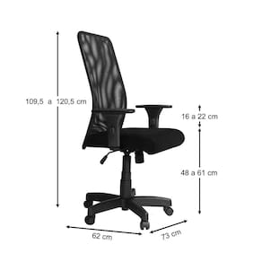 Base giratória preta com relax e regulagem de altura com sistema a gás. Encosto de Tela 100% Poliéster extra forte com resina anti-encolhimento. Assento com Espuma Injetada D-45, extra conforto com alta qualidade. Tapeçada com tecido espumado extra macio.