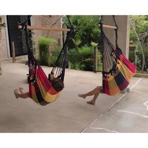 Cadeira suspensa que pode ser instalada em diversos locais como sacadas, varandas, parques, acampamentos, em casa, quintal, etc. Pode ser pendurada em vigas, lajes, árvores, telhados ou em qualquer lugar que tenha altura e suporte o peso recomendado.Perfeita para decorar ambientes e para descansar com conforto.Fácil de instalar: basta retirar da embalagem, inserir a madeira na parte do assento e cordas de sustentação. É só pendurar onde desejar.Planejada para ser utilizada por pessoas de qualquer altura com conforto.Se o local de instalação for muito alto, pode-se utilizar corda, corrente ou qualquer extensor para que fique na altura ideal.Acompanha:* Madeira de sustentação* Corda (punhos) de sustentação* Assento e apoio para as costasEspecificações:-Madeira de alta resistência com 95 cm de largura-Suporta até 90 kg-De fácil montagem e instalação-Tecido feito com 100% Algodão-Fácil de lavar, pode ser à mão ou em máquinas-Peso do produto: +/- 1,900 kg incluindo a madeira-Altura mínima entre o piso e o local a ser instalada recomendada é de 2,00 m.