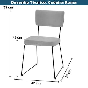 A cadeira Roma possui o encosto e o assento em MDF, revestida com espuma D28 e tecido e a base é em aço carbono pintado de preto.