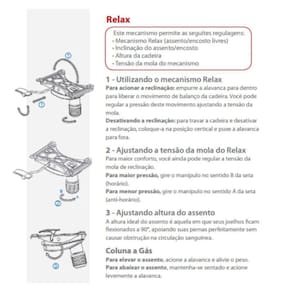 Mecanismo e Base: Relax giratório com trava na posição de operação, sistema de ajuste de tensão do relax e mecanismo a gás para subida e descida do sistema, aranha preta e rodízios de duplo giro de nylon. Pistão pneumático com acabamento de telescópio preto.