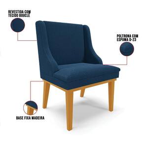 A Cadeira de Jantar Liz é a escolha perfeita para quem quer transformar a sua sala de jantar com muito estilo, conforto e durabilidade. Com um design moderno e sofisticado, essa cadeira é perfeita para compor ambientes de jantar ou cozinhas que pedem um toque de elegância. Sua Base Fixa de Madeira Castanho e o revestimento em tecido Bouclê Azul se harmonizam facilmente com diferentes estilos de decoração, deixando sua mesa de jantar ainda mais convidativa. Feita com madeira de reflorestamento eucalipto e pinus, a Cadeira Liz é resistente e sustentável, suportando até 120 kg. Sua estrutura robusta, aliada ao acabamento impecável e à espuma de qualidade D-23, garante um assento confortável para aproveitar cada refeição com prazer. A Cadeira Liz é prática e fácil de transportar, com um peso leve e tamanho compacto, ideal para cozinhas e salas de jantar de todos os tamanhos. Além desse modelo, também temos a opção com base/pés e uma grande variedade de tecido/cores para atender ao seu estilo e conforto. E para deixar seu ambiente ainda mais harmonioso, oferecemos também kits especiais, incluindo: (2, 4 e 6 lugares) no mesmo design. Caso queira ajuda para escolher a melhor opção para o seu espaço, estamos à disposição! Aproveite e garanta já a sua. OBSERVAÇÃO IMPORTANTE: A entrega é realizada no endereço informado, não realizamos o transporte para andares superiores, como subir escadas, elevadores ou guinchos. Não realizamos montagens, desmontagens ou instalações. Todos esses serviços são de responsabilidade do comprador. Dimensões do Produto: Altura Total: 85 cm Largura Total: 55 cm Profundidade Total: 55 cm Peso: 15 kg Outras medidas: Altura do Encosto: 40 cm Largura do Assento: 45 cm Profundidade do Assento: 50 cm Altura do chão ao Assento: 45 cm Especificações do Produto: Estrutura: Madeira Eucalipto Espuma: D-23 Tecido: Bouclê Peso Suportado: Até 120 Kg Tipo de Pés: Base Fixa Madeira Tipo de Encosto: Fixo Tipo de Assento: Fixo Complexidade da Montagem: Baixo Montagem: O produto vai montado, apenas parafusar a base Garantia: 90 dias contra defeito de fabricação Instruções de Limpeza: Utilizar um pano limpo e levemente úmido Você irá Receber: 04 Cadeira Sala de Jantar - Entregue em: 02 Volume