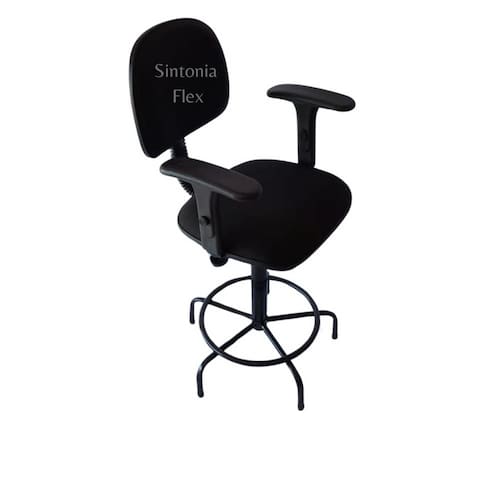 Cadeira secretaria caixa alta com braço de regulagem de altura - - base de ferro fixa - recpçao balcao tecido preto Cadeira caixa - aro para apoio dos pés - prolongador de altura - madeira reflorestada - espuma injetada - bordas em pvc flexivel - pés fixo - braço com regulagem Altura do chão ao assento: Mínima 62 cm Máximo 75 cm Marca: Sintonia Flex Ean: 7895103601789