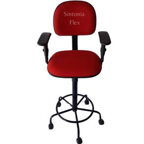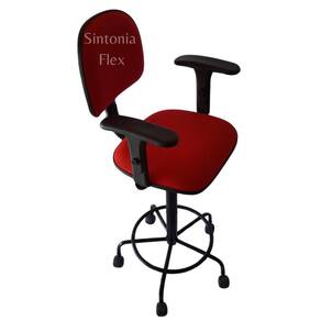 Cadeira secretaria caixa alta - braço com regulagem de altura - estrela de ferro com rodízio - aro - tecido vermelho Cadeira caixa - aro para apoio dos pés - prolongador de altura - madeira reflorestada - espuma injetada - revestida em corano cipatex - bordas em pvc flexivel - pés de ferro com rodízio - pintura eletrostática epoxi - estrutura em aço com acabamento em pvc Altura do chão ao assento: Mínima 63 cm Máximo 75 cm Peso maximo recomendado: 110 kl Marca: Sintonia Flex Ean: 7895103600683