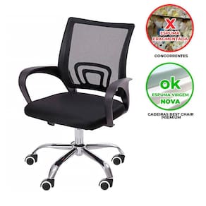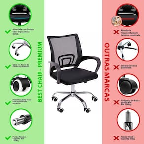 Cadeira secretária de escritório giratória mesh pretaCadeira ergonômica mesh best premium chair com braços em nylon e aço.A cadeira escritório executiva giratória best chair mesh é perfeita para o seu escritório, seja home office ou na empresa, ou até para demais estabelecimentos executivos. Esse modelo é versátil, ergonômico e extremamente confortável devido a sua estrutura em plástico resistente e o seu encosto com tecido em mesh que faz com que o assento se adéque ao seu corpo.Ideal para:Escritórios residenciais home office , empresas, estúdios, salas executivas e de reunião entre outros ambientes.CaracterísticasEspuma virgem nova - não tem fraguimentos reciclados;Rodinhas anti ruído e riscos;Ideal para pisos de madeira;Se adéqua ao corpo devido ao encosto em tecido;Cadeira ergonômica que aperfeiçoa a postura;Características técnicas:Modelo: bc;Marca: best chair;Pistão nivel 2 - alta qualidade;Encosto: costas em nylon mesh;Largura: 43 cm;Altura: 45 cm;Altura máxima até o chão: 97 cm;Altura mínima até o chão: 87 cm;Revestimento: nylon, tela mesh net nylon ;Braço: polipropileno;Espuma: com densidade controlada;Fácil instalação;Ajuste de altura: sim.Assento:Profundidade: 49cm;Largura: 47cm;Altura máxima até o chão: 50 cm;Altura mínima até o chão: 40;Braços:Altura do braço: 18 cm;Comprimento: 31 cm;Largura: 5 cm;Largura entre os braços do assento: 47 cm;Itens inclusos:01 cadeira desmontada;Acessórios para montagem;01 manual de montagem.Não nos responsabilizamos pela montagem do produto.A cadeira vai desmontada na caixa que leva um manual e chave para montagem.Garantia:3 meses de garantia.