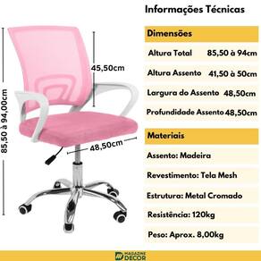 Tonalidade: Rosa | Altura: 94 | Produto: Cadeira Secretária Office | Largura: 48,50 | Material da Estrutura: Metal Cromado | Cor: Rosa | Peso do Produto: 8 | Fabricante: Magazine Decor | Cômodo Indicado: Escritórios | Selecione: Cadeira Secretária Office | do modelo: 1 | Exige montagem: Sim | Baterias são necessárias?: Não | Certificação de teste externa: Não | Is Fragile: Não | de caixas: 1 | Dimensões do artigo: 94x48,50x48,50 | da peça: 1 | Principais Características do Produto (bullet_point#0): A Cadeira de Escritório Secretária Base Giratória é perfeita para você deixar o seu espaço de trabalho ou estudo mais confortável e sofisticado! A Cadeira de Escritório Secretária é uma ótima escolha tanto para o seu conforto quanto para a sua decoração | Principais Características do Produto (bullet_point#1): A Cadeira de Escritório Secretária conta com uma base giratória com rodinhas, isso facilita consideravelmente a sua navegabilidade na mesa de trabalho. Sem contar com seu apoio de braço, ideal para você estudar ou trabalhar de forma mais aconchegante e confortável. | Principais Características do Produto (bullet_point#2): Outro diferencial da Cadeira de Escritório é que ela é produzida com materiais e acabamentos de alta qualidade, seu assento é feito em Madeira Compensada com revestimento em tecido, já a sua estrutura é feita em metal cromado | Peso do pacote: 8 | Componentes incluídos: Rodízios | Quantidade de itens: 1 | Dimensões do item P x L x A: 94x48,50x48,50