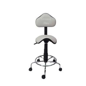 Cadeira sela estetica - regulagem de altura a gás - para dentista, manicure, tatuador, estrela cromada corano branco Cadeira sela - regulagem de altura a gás - espuma injetada , revestida em corano cipatex - bordas em pvc flexivel - apoio para os pés - base cromada - com rodízios. Altura do chão ao assento máximo 53cm mínimo 43cm Marca: Não Informado