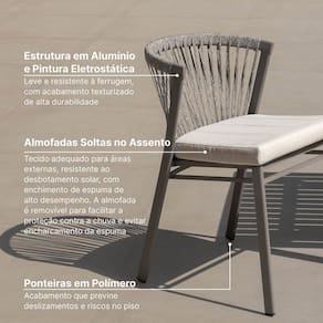 Feitos de alumínio leve e de alta resistência, nossos móveis são ideais para áreas externas, graças à sua resistência à ferrugem. Além disso, o acabamento em pintura eletrostática de alta qualidade garante proteção contra intempéries, preservando a beleza do seu mobiliário por muito mais tempo.