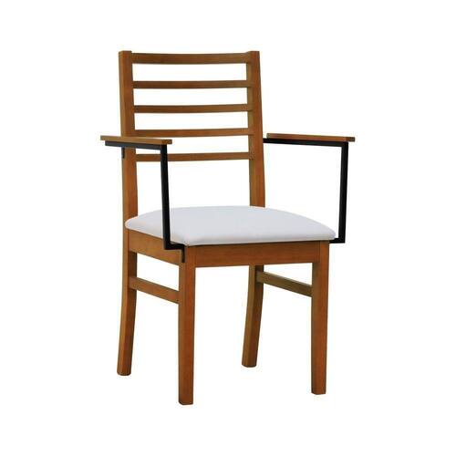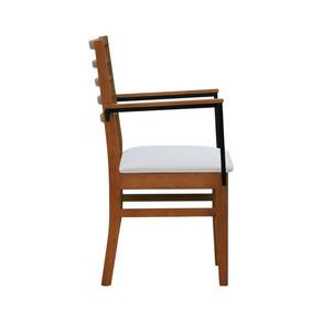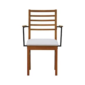 - Materiais: Estrutura em madeira de eucalipto maciço, assento estofado e encosto ripado, braços em aço de carbono com pintura epóxi e madeira tingida na cor amêndoa.