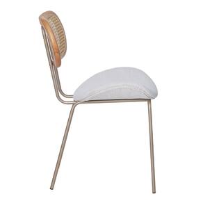 Nossa Cadeira Toscana Base Champagne - Nude Tecido combina um design moderno com um toque de charme vintage. O assento possui um formato ergonômico e é revestido em PU claro e suave, sugerindo conforto e um toque de sofisticação discreta. O encosto oval apresenta uma estrutura em madeira clara que emoldura um detalhe em telinha rattan trançado, adicionando uma textura natural e um apelo visual único à peça.