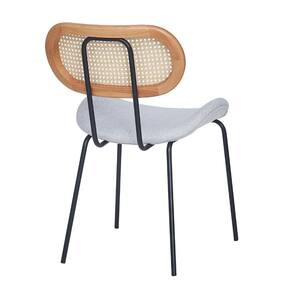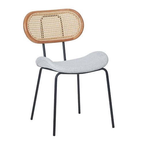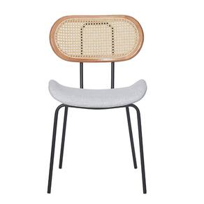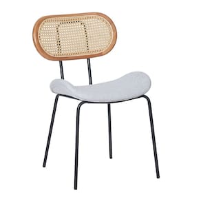 Nossa Cadeira Toscana Base Preta - Tecido Cinza combina um design moderno com um toque de elegância natural. O assento possui um formato ergonômico e é revestido em um PU claro, sugerindo conforto e um toque de sofisticação discreta. O encosto oval apresenta uma estrutura de madeira clara que emoldura um detalhe em telinha rattan trançado, adicionando uma textura natural e um apelo visual único à peça.