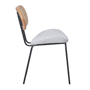 A cadeira é sustentada por quatro pernas finas de metal preto, que proporcionam um contraste elegante com o tecido e a madeira, além de conferir leveza visual à estrutura. A combinação de materiais – o tecido macio, a madeira natural e o metal delicado – cria um equilíbrio estético interessante, tornando esta cadeira uma adição estilosa e confortável a diversos ambientes. É uma peça que certamente atrairá olhares e proporcionará momentos agradáveis.