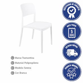 - A Cadeira Tramontina Serena em Polipropileno na cor branca combina elegância e resistência em um único produto. Ideal para quem busca conforto e durabilidade, ela é perfeita para ambientes internos ou externos.