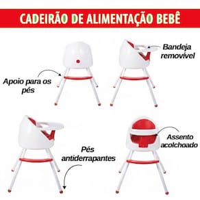 Versatilidade para cada etapa: Modo Refeição (6 meses+): Pode ser utilizada como cadeirão alto tradicional ou assento elevatório (booster) acoplado a uma cadeira comum. Modo Atividades (3 anos+): Transforma-se em uma cadeirinha baixa, ideal para desenhar, brincar e interagir à mesa. Modo Diversão (8 meses+): Base equipada com rodinhas e volante lúdico para entretenimento supervisionado dentro de casa.