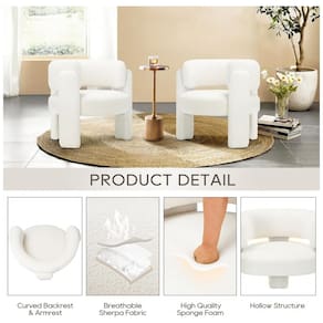 O kit de cadeiras COLAMY traz duas cadeiras estofadas em formato barril, com revestimento tipo veludo sherpa em tom creme, projetadas para uso em sala de estar, quarto, recepção ou cantos de leitura. A combinação de encosto curvo contínuo, braços integrados e assento acolchoado em espuma de alta densidade proporciona apoio firme e confortável para uso prolongado em ambientes internos.