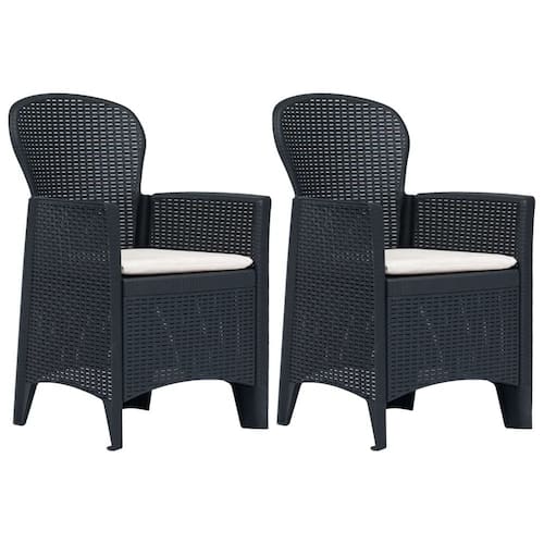 - Número de itens: 2- - Cor: antracite- - Material: plástico sintético - - Interno/externo: somente ao ar livre - Capa incluída: Não- - Sala: jardim e terraço- - Dimensões: 22,4 x 23,2 x 35,0 pol. (L x C x A) - - Altura da superfície: 1,2 pol.- - Altura da perna: 17,1 pol.- - Peso: 11,02 libras- - Profundidade do assento: 19,7 pol.- - Balanços: Não- - Marca: vidaXL- - A entrega contém: 2 cadeiras, 2 almofadas de assento- - Montagem necessária: Sim- - SKU: 45599- - EAN: 8719883552576-