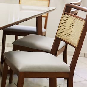 Cadeiras para Mesa de Jantar Madeira Maciça - Luna - Art Salas As Cadeiras Luna possuem um design moderno e funcional. Sua base é feita de madeira maciça Tauari, possuem espuma na densidade D-24, e encosto em fibra de rattan. Seu assento suporta até 150 kg distribuídos. Confira e aproveite! Fazem parte do anúncio: 2 Cadeiras Luna Obs: Objetos de decoração não fazem parte deste anúncio Particularidades da Cadeira: Características: - Estrutura em Madeira Maciça Tauari. (laminada) - Assento estofado - Espuma com Densidade D-23 - Design moderno, sofisticado e diferenciado. - Madeira Ecologicamente Correta. - Baseado em conceitos sustentáveis. - Madeira altamente resistente. -Suporta até 150 kg distribuídos - Encosto com telinha ( Rattan) Dimensões da Cadeira: Altura: 92 centímetros Largura: 49 centímetros Profundidade: 48 centímetros Informações Importantes: -Produtos podem apresentar diferenças de tonalidades entre a foto na tela e o produto real, devido a calibração de cor de tela. -Limpar com flanela ou pano macio. Não utilizar álcool. Não utilizar produtos abrasivos ou corrosivos -Nós prezamos pela qualidade da entrega em primeiro lugar, trabalhamos com transportadoras altamente selecionadas e os melhores materiais de embalagem. - As cadeiras vão 100% montadas nas caixas e embaladas. Não necessita da montagem de um profissional. -Certifique-se de que o produto caiba em elevadores e vãos de escadas, não fazemos içamentos ou desmontagens de produtos. Quaisquer despesas deste tipo ficam a cargo do cliente -Garantia de 3 meses contra defeitos de fabricação Marca: Não Informado