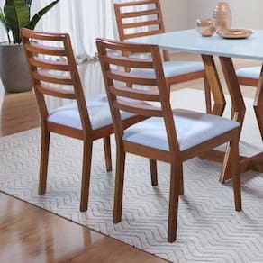 As Cadeiras Valença possuem um design moderno e funcional. Sua base é feita de madeira maciça Tauari, possuem espuma na densidade D-24. Seu assento suporta até 150 kg distribuídos. Confira e aproveite!