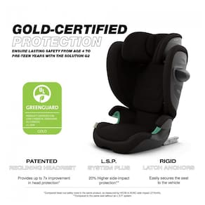 Cadeirinha booster alta costas Cybex Solution G2 Moon Black oferece estrutura dobrável para armazenamento compacto, instalação rígida via Latch e proteção lateral linear com sistema L.S.P. Plus integrado à casca absorvedora de energia e encosto de cabeça reclinável. Projetada para uso em veículos com orientação forward-facing, suporta crianças em fase de transição de assentos com arnês para booster, com peso máximo de 54 kg e ajuste de altura em 3 posições. Ideal para viagens, ocupa até 1/3 menos espaço quando dobrada, compatível com bagageiro de carro ou compartimento superior de aeronave.