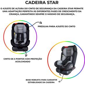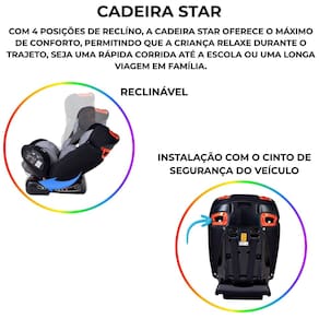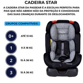 Cadeirinha para carro bebê passear star grup o+ i ii e iii 0 à 36 kg preto com cinza A cadeira star da passear é a escolha perfeita para pais que não abrem mão da proteção e comodidade das suas crianças durante os deslocamentos. Projetada para acompanhar o crescimento da criança, a cadeira star é um dispositivo de retenção para o grupo 0+, 1, 2 e 3, suportando pesos de 0 até 36kg, garantindo proteção desde os primeiros dias até a infância. Com 4 posições de reclíno, a cadeira star oferece o máximo de conforto, permitindo que a criança relaxe durante o trajeto, seja uma rápida corrida até a escola ou uma longa viagem em família. O tecido removível e lavável facilita a limpeza e manutenção da cadeira, garantindo que ela esteja sempre pronta para uso, mesmo após as aventuras mais animadas. Principais características: - dispositivo de retenção para crianças do grupo 0+, 1, 2 e 3 de 0 até 36 kg - cinto de segurança de 5 pontos - ajuste de altura do cinto de segurança do drc - cadeira com sistema de instalação com cinto de segurança do carro - possui 4 posições de reclino - tecido removível e lavável - base robusta - inmetro: 010935/2022 - certificado nbr 14400 - de 12 meses direto com o fabricante