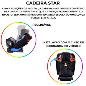 Cadeirinha para carro bebê passear star grup o+ i ii e iii 0 à 36 kg preto com cinza A cadeira star da passear é a escolha perfeita para pais que não abrem mão da proteção e comodidade das suas crianças durante os deslocamentos. Projetada para acompanhar o crescimento da criança, a cadeira star é um dispositivo de retenção para o grupo 0+, 1, 2 e 3, suportando pesos de 0 até 36kg, garantindo proteção desde os primeiros dias até a infância. Com 4 posições de reclíno, a cadeira star oferece o máximo de conforto, permitindo que a criança relaxe durante o trajeto, seja uma rápida corrida até a escola ou uma longa viagem em família. O tecido removível e lavável facilita a limpeza e manutenção da cadeira, garantindo que ela esteja sempre pronta para uso, mesmo após as aventuras mais animadas. Principais características: - dispositivo de retenção para crianças do grupo 0+, 1, 2 e 3 de 0 até 36 kg - cinto de segurança de 5 pontos - ajuste de altura do cinto de segurança do drc - cadeira com sistema de instalação com cinto de segurança do carro - possui 4 posições de reclino - tecido removível e lavável - base robusta - inmetro: 010935/2022 - certificado nbr 14400 - de 12 meses direto com o fabricante Marca: Não Informado