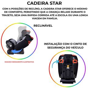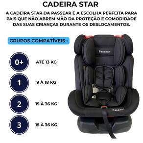 Cadeirinha para carro bebê passear star grup o+ i ii e iii 0 à 36 kg preto A cadeira star da passear é a escolha perfeita para pais que não abrem mão da proteção e comodidade das suas crianças durante os deslocamentos. Projetada para acompanhar o crescimento da criança, a cadeira star é um dispositivo de retenção para o grupo 0+, 1, 2 e 3, suportando pesos de 0 até 36kg, garantindo proteção desde os primeiros dias até a infância. Com 4 posições de reclíno, a cadeira star oferece o máximo de conforto, permitindo que a criança relaxe durante o trajeto, seja uma rápida corrida até a escola ou uma longa viagem em família. O tecido removível e lavável facilita a limpeza e manutenção da cadeira, garantindo que ela esteja sempre pronta para uso, mesmo após as aventuras mais animadas. Principais características: - dispositivo de retenção para crianças do grupo 0+, 1, 2 e 3 de 0 até 36 kg - cinto de segurança de 5 pontos - ajuste de altura do cinto de segurança do drc - cadeira com sistema de instalação com cinto de segurança do carro - possui 4 posições de reclino - tecido removível e lavável - base robusta - inmetro: 010935/2022 - certificado nbr 14400 - de 12 meses direto com o fabricante Marca: Não Informado
