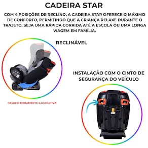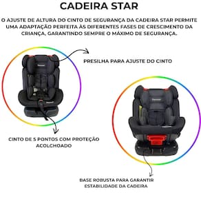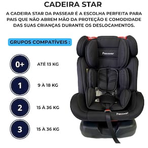 Cadeirinha para carro bebê passear star grup o+ i ii e iii 0 à 36 kg preto A cadeira star da passear é a escolha perfeita para pais que não abrem mão da proteção e comodidade das suas crianças durante os deslocamentos. Projetada para acompanhar o crescimento da criança, a cadeira star é um dispositivo de retenção para o grupo 0+, 1, 2 e 3, suportando pesos de 0 até 36kg, garantindo proteção desde os primeiros dias até a infância. Com 4 posições de reclíno, a cadeira star oferece o máximo de conforto, permitindo que a criança relaxe durante o trajeto, seja uma rápida corrida até a escola ou uma longa viagem em família. O tecido removível e lavável facilita a limpeza e manutenção da cadeira, garantindo que ela esteja sempre pronta para uso, mesmo após as aventuras mais animadas. Principais características: - dispositivo de retenção para crianças do grupo 0+, 1, 2 e 3 de 0 até 36 kg - cinto de segurança de 5 pontos - ajuste de altura do cinto de segurança do drc - cadeira com sistema de instalação com cinto de segurança do carro - possui 4 posições de reclino - tecido removível e lavável - base robusta - inmetro: 010935/2022 - certificado nbr 14400 - de 12 meses direto com o fabricante Marca: Não Informado