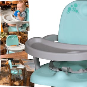 Adapta-se facilmente as cadeiras comuns de adulto, com tiras de fixação para maior segurança, ajustável em 3 posições de altura, cintos de segurança para o bebê, bandeja removível e fechamento muito fácil e ultra-compacto com alça para transporte.