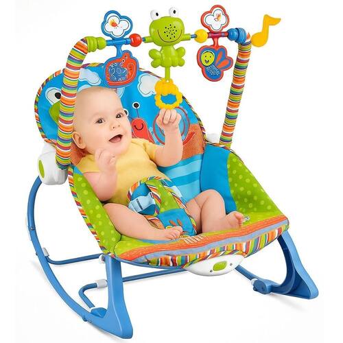 Destaques do Produto: • Indicado para recém-nascidos e bebês maiores (0m+) • Vibrações calmantes que ajudam no sono • Barra de brinquedos com cores vivas e estímulo sensorial • Toca músicas suaves para acalmar o bebê • Suporta até 18 kg (40 lbs) • Conversível para cadeira de criança (toddler rocker) • Design dobrável, leve e fácil de transportar