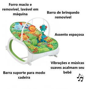 A cadeira apresenta função musical, vibra para ninar e ainda traz divertidos e fofos brinquedos para serem pendurados no arco. A cadeirinha é fundamental para ajudar no dia a dia das mamães que precisam realizar inúmeras tarefas, pois relaxa e entretém o bebê durante todo o dia e garantindo seu conforto. Tudo pensado para o deixar mais tranquilo, relaxado e feliz!