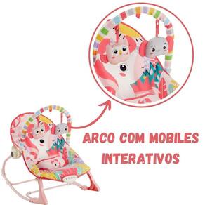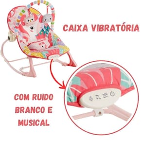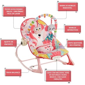 Principais características: - peso recomendado: até 18kgs - idade recomendada de 0 a 12meses - modo balanço até 7kg - modo cadeira até 18kg - cinto de segurança de 3 pontos - alça removível com 2 mobiles - caixa vibratória e musical com sons da natureza, ruido branco, e melodias suaves que acalmam o bebê. Necessários 3 pilhas aa não inclusas - ajuste para função balanço ou deitado com trava - acolchoado fofo e tecido removível para limpeza
